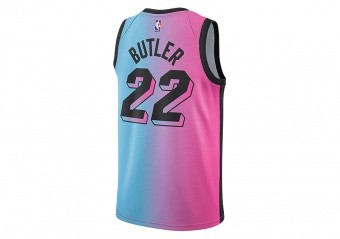 Koszulka 2020-21 Nike NBA Miami Heat City Edition Swingman składa hołd przeszłości stroju prezentowanej przez pryzmat przyszłości miasta. Najnowsza wersja, wzorowana na poprzednich kolorowych modelach, jest ozdobiona poziomym gradientem przechodzącym od charakterystycznego dla drużyny różu, przez niebieski do fioletowego, co nadaje butom wyjątkowy dwustronny wygląd — dwa stroje w jednym zależnie od kąta patrzenia.